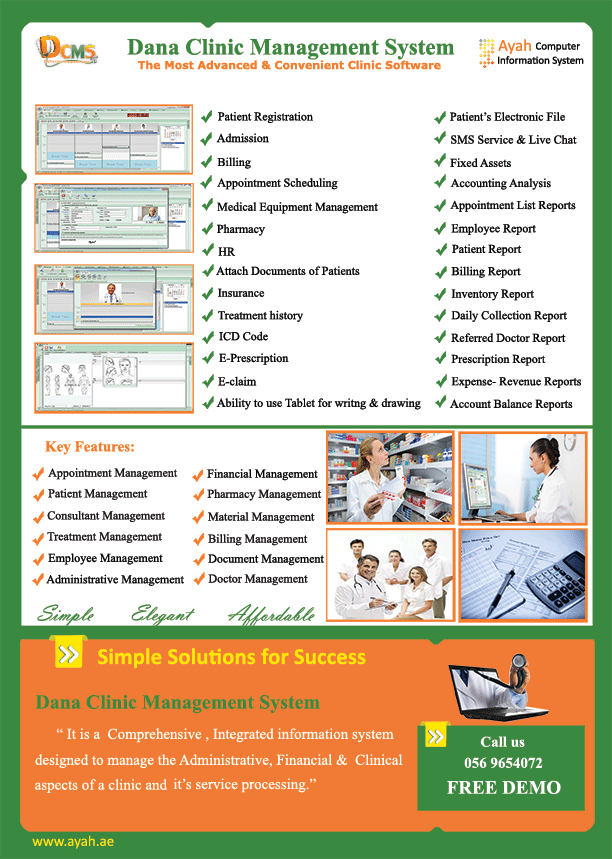 Dana Clinic Management System (DCMS): The Most Advanced & Convenient Clinic Management Software."It is a comprehensive, user friendly & integrated information system designed to manage the Administrative, Financial & Clinical aspects of a Clinic and its service processing"